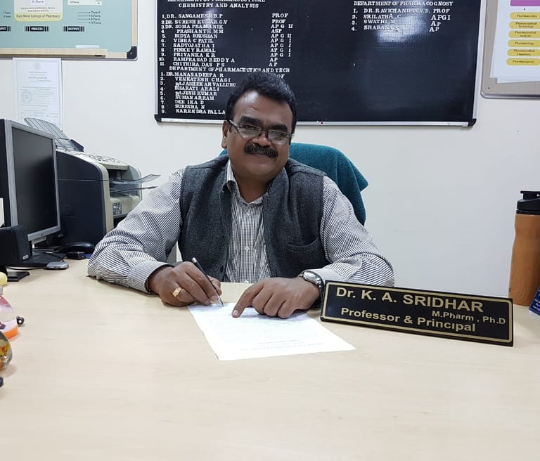It is my great pleasure to welcome you to East West Institute of Pharmaceutical Sciences, a premier pharmacy institution dedicated to provide high-quality education, research, and practice in the field of pharmacy. As the Principal of this esteemed institution, I am committed to fostering a culture of excellence, innovation, and community engagement that prepares our students to become competent, compassionate, and innovative pharmacists.